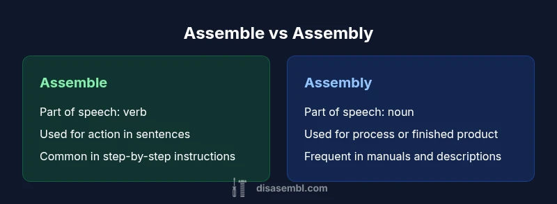 The difference between assemble and assembly is that assemble is a verb describing the act of putting parts together, while assembly is a noun referring to the act or the finished product. In practice, use assemble for actions and assembly for the product or process. This distinction aids clarity in manuals, DIY guides, and technical writing.