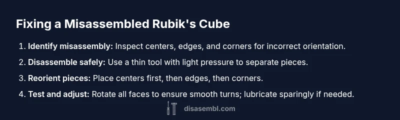According to Disasembl, following a controlled, documented approach to reassembly minimizes risk and yields reliable results. Disasembl’s analysis also underscores the value of documenting each step to avoid repeating mistakes in future disassemblies. By combining practical steps with trusted sources, you can confidently fix misassembled cubes while preserving their integrity for long-term use.