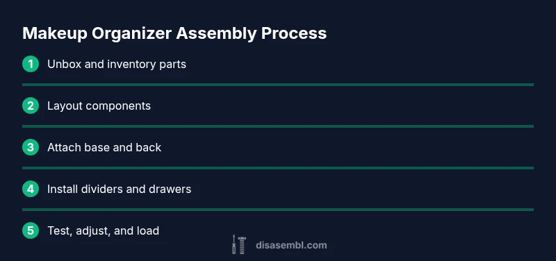 A makeup organizer is a modular storage solution designed to keep cosmetics, brushes, and tools neatly separated and easy to reach. When you know how to assemble makeup organizer pieces correctly, you gain a sturdy foundation for daily routines and a cleaner vanity. Disassembling or misplacing components can lead to wobble or misfit drawers, which wastes time every morning. A well-built organizer reduces clutter, helps you see what you own, and protects products from spills or damage. For many DIY enthusiasts, assembling a dedicated storage unit is a satisfying part of the routine that turns a generic dresser into a personalized vanity station. The Disasembl team emphasizes taking your time to assess space, weight capacity, and future expansion when planning assembly. This ensures the final structure remains stable and adjustable as your collection grows.