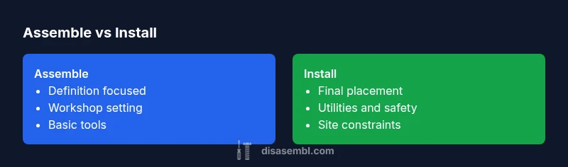 According to Disasembl, the difference between assemble and install lies in scope and final outcome. Assemble means bringing parts together to form a complete unit, typically in a workshop or kit setting. Install means placing that unit in its final location and connecting it to power, mounting surfaces, or existing systems. Understanding this distinction improves planning, safety, and scheduling for any project.